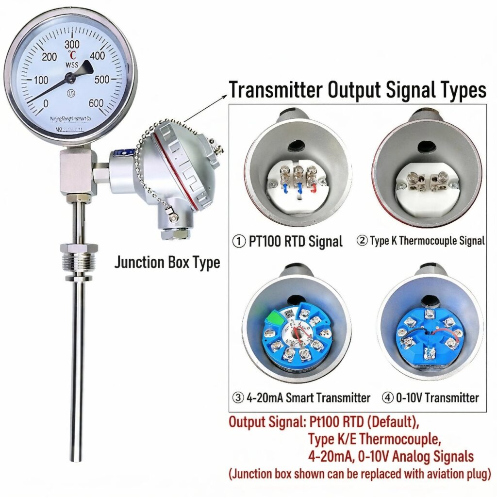This bimetallic thermometer features both local display and remote data transmission capabilities, meeting a variety of industrial field requirements.